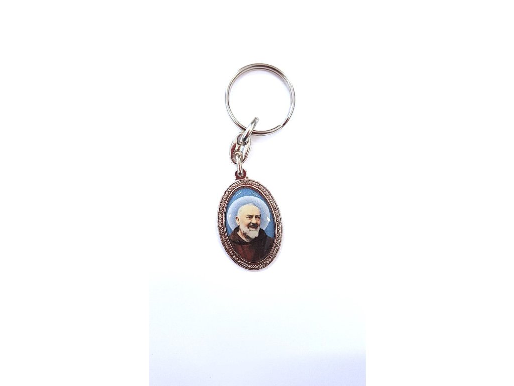 Katechismus katolické církve říká: Svědkové, kteří nás předešli do království, zvláště ti, které církev uznává jako „svaté“, jejich přímluva je nejvyšší službou, jakou prokazují Božímu plánu. Můžeme a máme je prosit, aby se přimlouvali za nás i za celý svět. Kovová klíčenka stříbrné barvy se zdobnějším okrajem vyrobeno v Itálii.