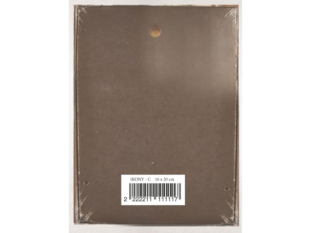 Reprodukce ikony na laminované dřevotřísce s celoplošně lakovaným povrchem. Okraj obrazu je jemně ohraničen zlatou barvou.