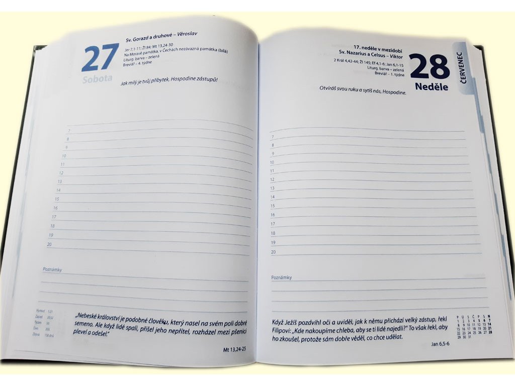Diář formátu A5 v pevné vazbě s obálkou modré či zelené barvy se zlatou ražbou. Ke každému dni je uveden církevní a občanský svátek, odkaz na denní modlitbu církve a na liturgické texty, antifona k žalmu a myšlenka na den. Na začátku každého měsíce jsou uvedeny úmysly Apoštolátu modlitby. Diář obsahuje také dostatečný prostor na poznámky, přehledný měsíční kalendář na roky 2025 a 2026 a další praktické informace.